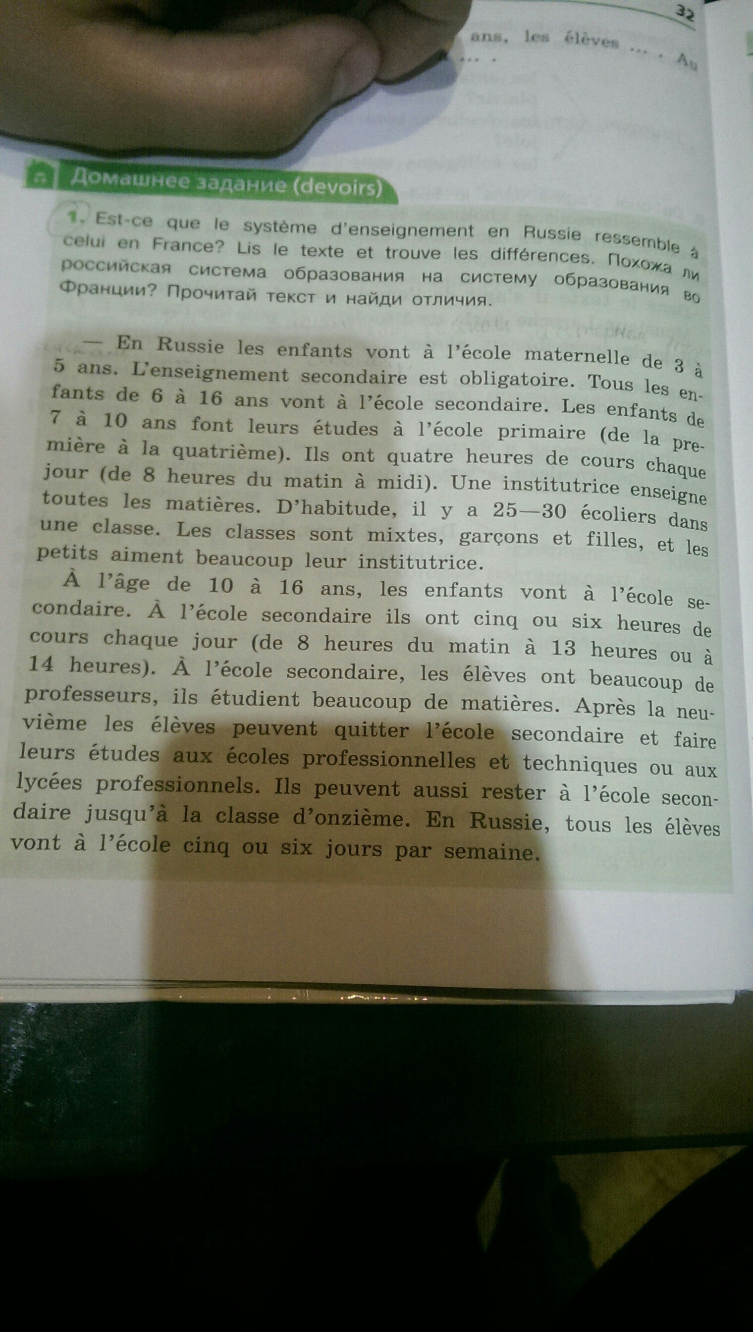 1. Доступна ли система образования во Франции? Прочтите текст и найдите различия. Похожа российская система образования на систему образования Франции? Прочитай текст и найди отличия. В России детский сад детей от 3 до 5 лет. Вторичное просвещение является обязательным. Все в. дети в возрасте от 6 до 16 лет переходят в среднюю школу. Дети в возрасте от 7 до 10 лет переходят в начальную школу (четвертый год). У них есть четыре часа занятий каждый день (с 8 утра до полудня). Учитель преподает все предметы. Обычно. в классе 25-30 школьников. Занятия смешанные, мальчики и девочки, и маленькие, как их учитель. В возрасте от 10 до 16 лет дети ходят в среднюю школу. В средней школе у них есть пять или шесть часов занятий (с 8:00 до 13:00 или 14:00). В средней школе у студентов много учителей и много предметов. После девятого дня студенты могут покидать среднюю школу и учиться в профессионально-технических училищах или профессионально-технических училищах. Можно поселиться в средней школе. к одиннадцатому классу. В России разработчики готовы вернуться пять или шесть дней в неделю