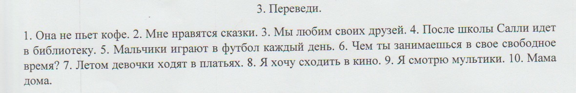 8) I want to go to the cinema. 9) I watch cartoons. 10) Mother is at home.