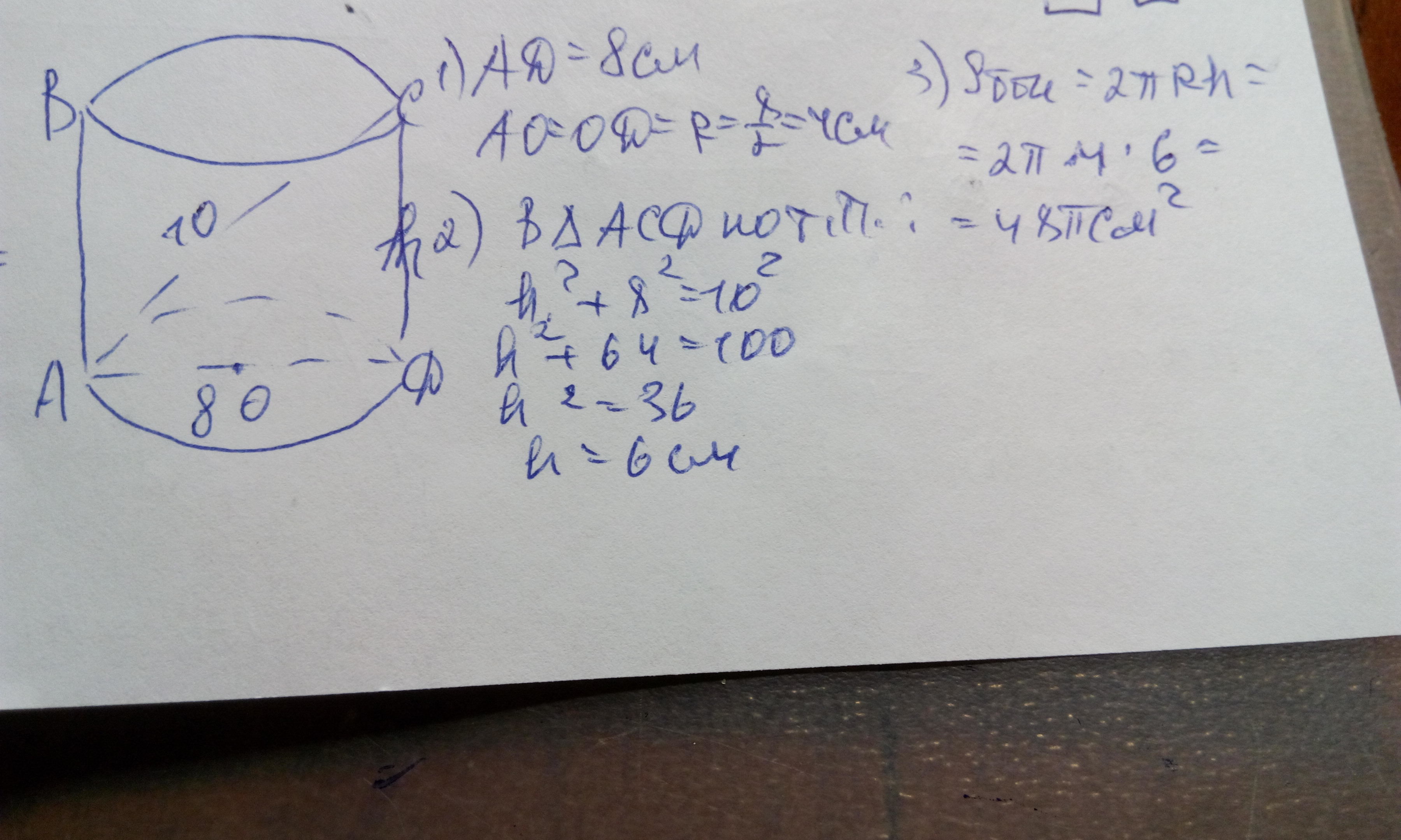 діагональ осьового перерізу циліндра дорівнює 10 см, а діаметєр основи 8 см. То площа бічної поверхні дорівнює