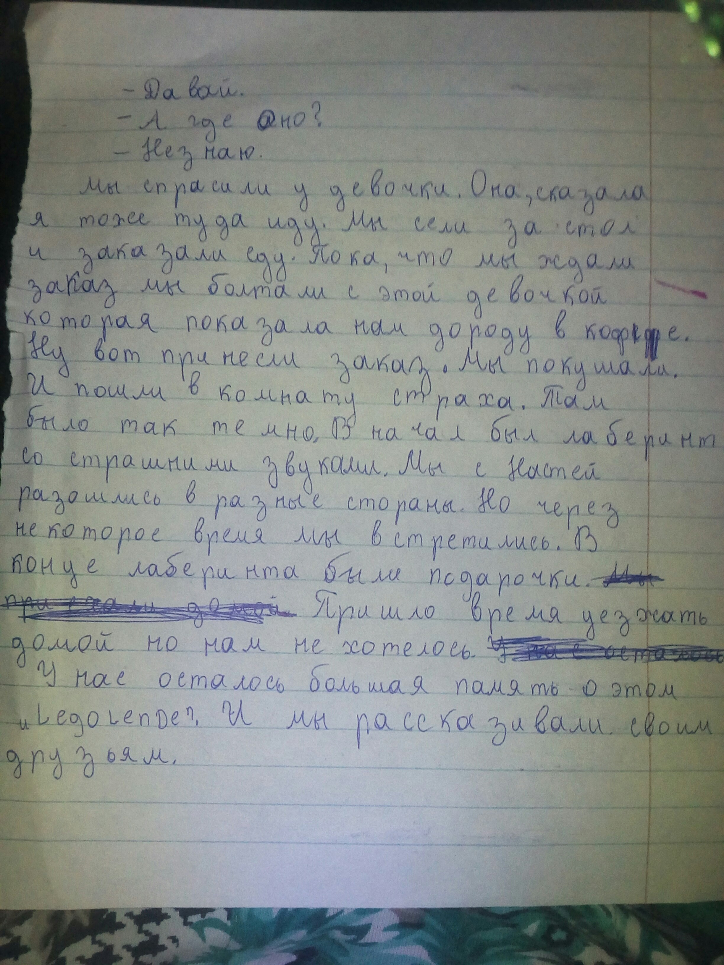 Мы споросили у девочки. Она сказала: "Я тоже туда иду". Мы сели за стол и заказали еду. Пока мы ждали заказ мы болтали с этой девочкой, которая показала нам дорогу в кафе. Ну вот, принесли заказ. Мы покушали и пошли в комнату страха. Там было так темно. В начале был лабиринт со страшными звуками. Мы с Настей разошлись в разные стороны, но через некоторое время мы встретились. В конце лабиринта были подарочки. Пришло время уезжать домой, но нам не хотелось. У нас осталась большая память об этом "Legolende" и мы рассказывали своим друзьям