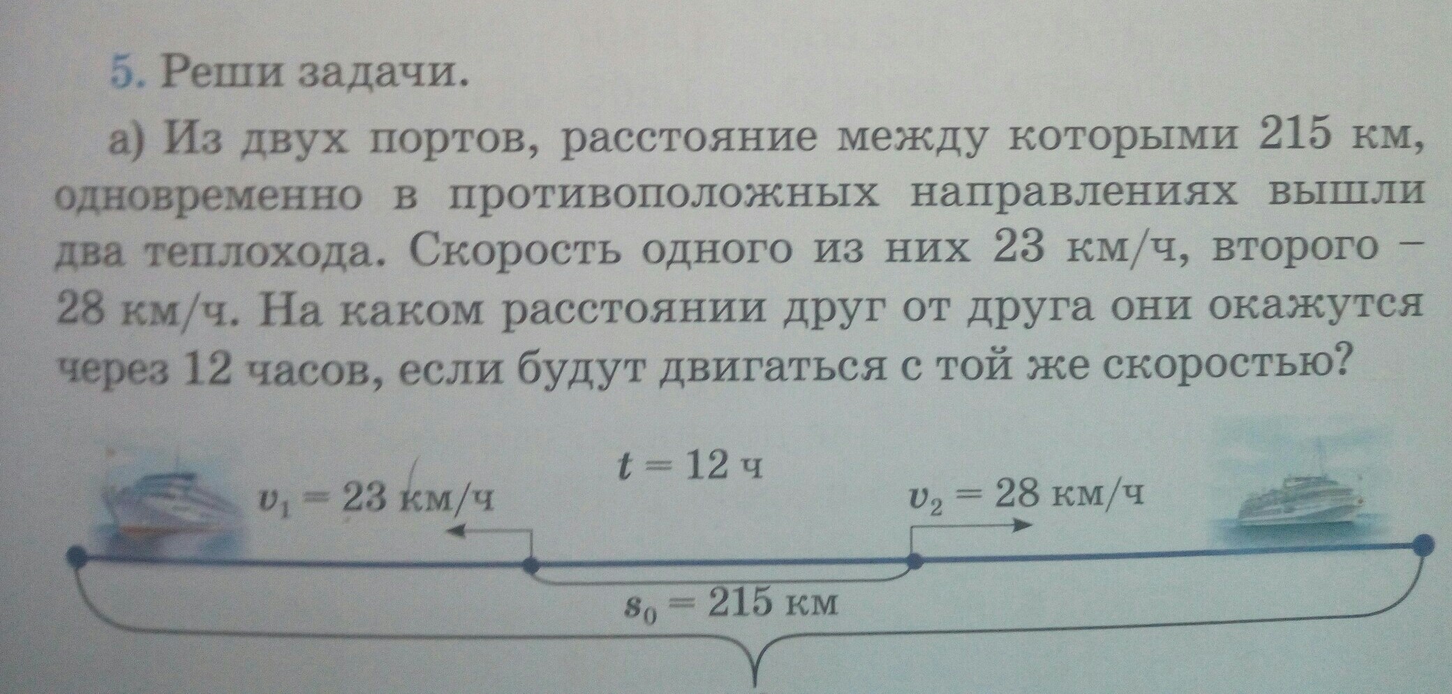 Из двух портов, расстояние между которыми 215 км, одновременно в противоложных направлениях вышли два теплохода. Скорость одного из них 23 км/ч, второго - 28 км/ч. На каком расстоянии друг от друга они окажутся через 12 часов, если будут двигаться с той же скоростью?