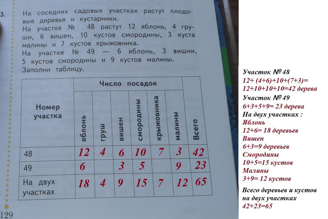 На соседних садовых участках растут плодовые деревья и кустарники. на участке № 48 растут 12 яблонь, 4 груши,6 вишен, 10 кустов смородины, 3 куста малины и 7 кустов крыжовника. на участке № 49 - 6 яблонь, 3 вишни, 5 кустов смородины и 9 кустов малины. Заполнить таблицу