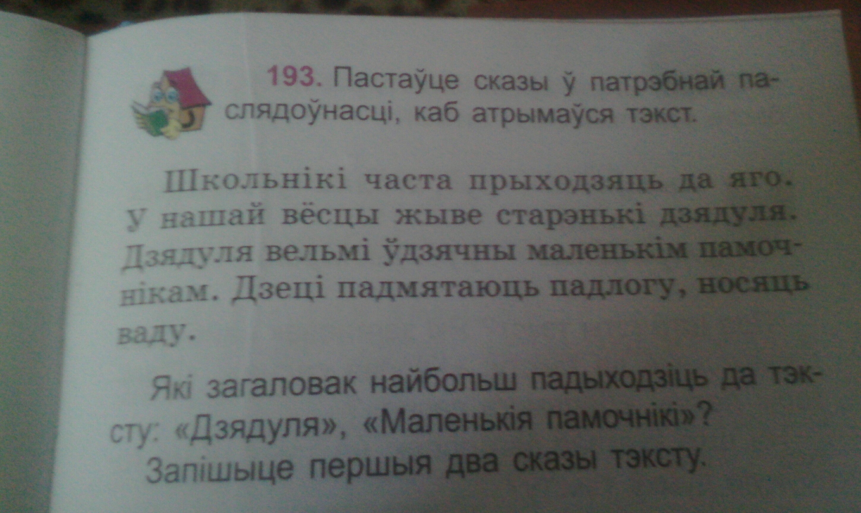1.У нашай весцы жыве старэнькi дзядуля . 2.Школьнiкi часта прыходзяць да яго. Дзецi падмятаюць падлогу, носяць ваду. Дзядуля вельмi удзячны маленькiм памочнiкам.