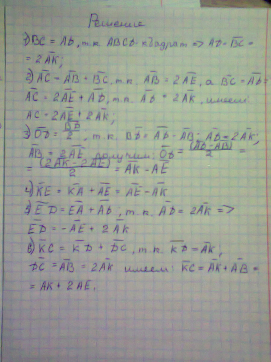Диагонали квадрата ABCD пересекаются в точке о, а точки Е и К - середины сторон АВ и АD соответственно. Выразите векторы:1)BC 2)AC 3)OD 4)KE 5) ED 6) KC через векторы АЕ и АK.