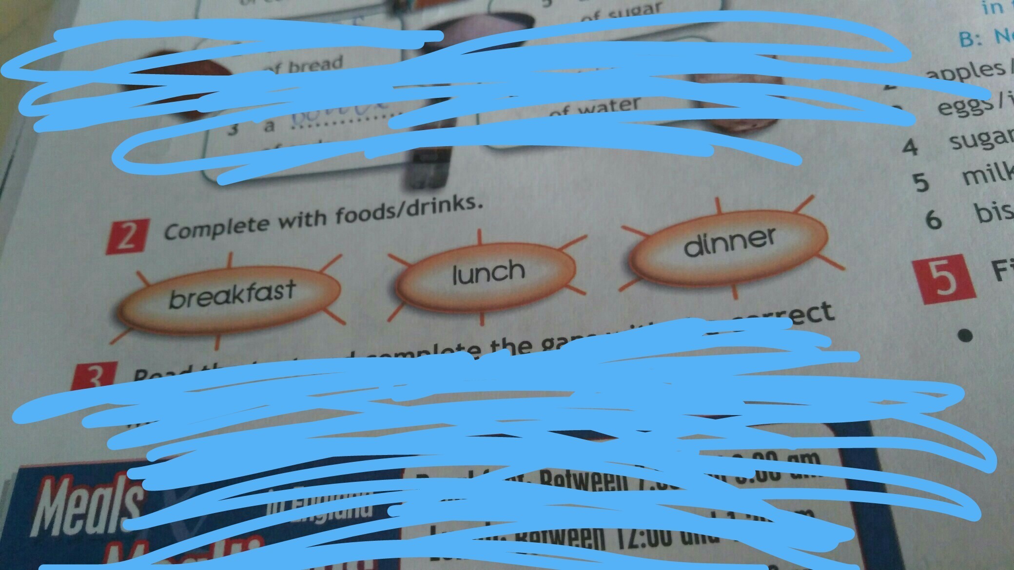 тут надо составить предложения по английскому что ты ешь на завтрак на обед и ужин