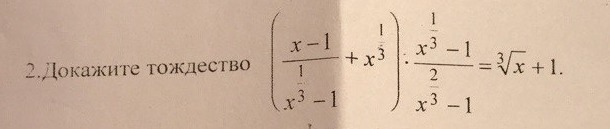 ( frac{x-1}{ x^{ frac{1}{3} }-1 } + x^{ frac{1}{3} } )* frac{ x^{ frac{1}{3} }-1 }{ x^{ frac{2}{3} } -1} = \ \ ( frac{( x^{ frac{1}{3} }-1)( x^{ frac{2}{3} } + x^{ frac{1}{3} }+1) }{ x^{ frac{1}{3} }-1 } + x^{ frac{1}{3} } )* frac{ x^{ frac{1}{3} }-1 }{ (x^{ frac{1}{3} } -1)( x^{ frac{1}{3} } +1)} = \ \ ( x^{ frac{2}{3} } + x^{ frac{1}{3} }+1+x^{ frac{1}{3} })* frac{1}{ x^{ frac{1}{3} } +1} = \ \ frac{( x^{ frac{1}{3} } +1)^2}{ x^{ frac{1}{3} } +1} = sqrt[3]{x} +1