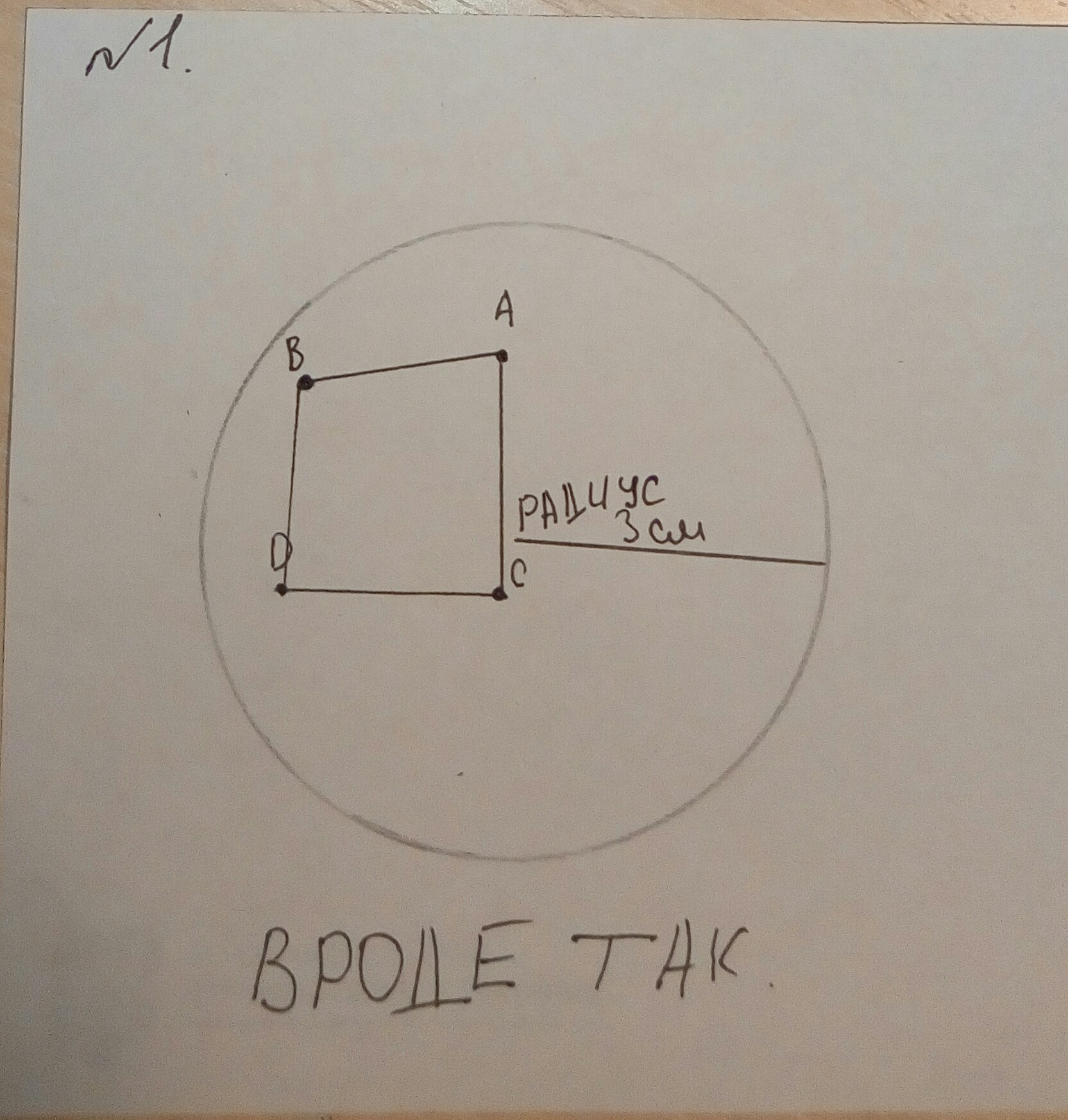 Начертите окружность, длина радиуса которой равна 3 см. Отметьте на окружности четыре точки и соедините их отрезками так, чтобы получился четырёхугольник.