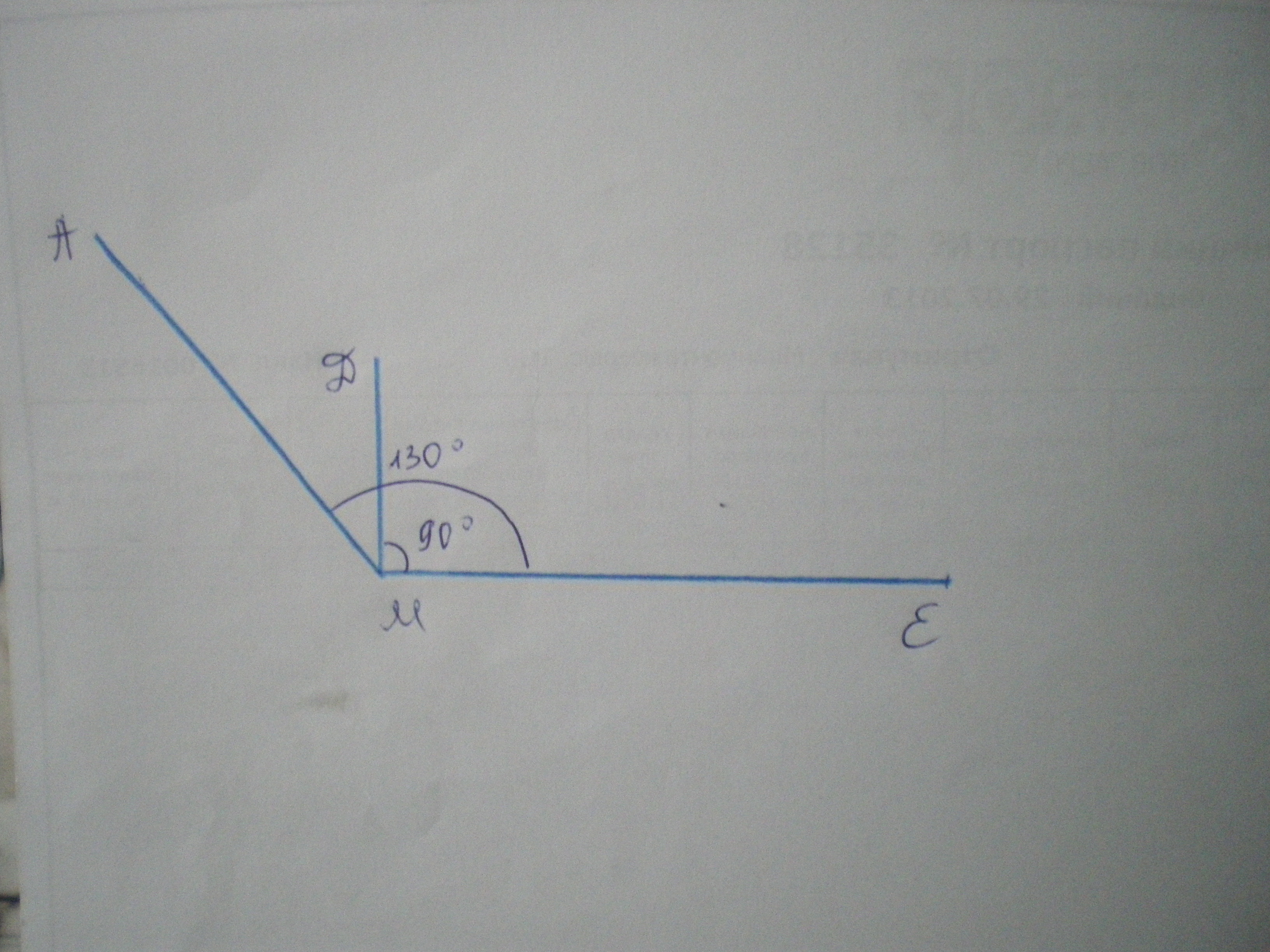 Начертите луч МЕ и постройте с одной стороны этого луча угол DME, а с другой стороны угол AME,такие , что угол DME=90 гр , а угол AME=130 гр