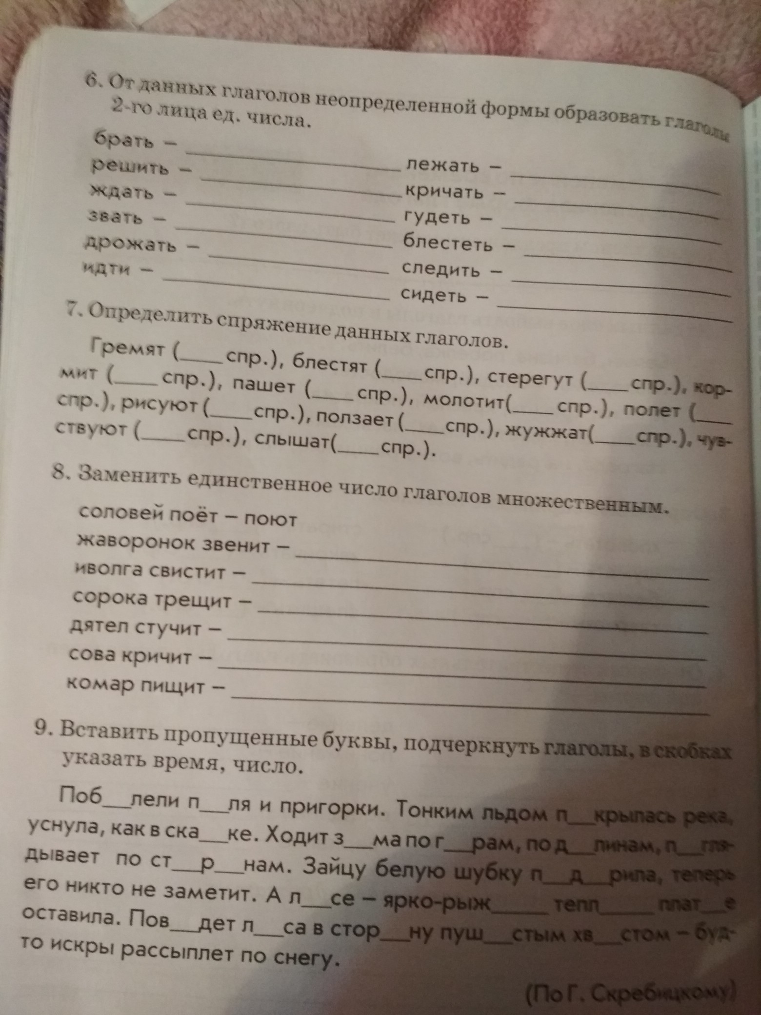 9. Побелели (наст.вр. мн. ч. Гл) поля и пригорки. Тонким льдом покрылась(гл. Наст. Вр. Ед ч.) река, уснула(гл. Наст. Вр. Ед. Ч.), как в сказке. Ходит(гл. Наст вр. Ед.ч.) зима по горам, по долинам, поглядывает(гл. Наст. Вр. Ед. Ч.) по сторонам. Зайцу белую шубку подарила(гл. Прош. Вр. Ед ч.) , теперь его никто не заметит. А лисе ярко рыжее тёплое платье оставила. Поведёт(гл. Буд. Вр. Ед. Ч.) лиса в сторону пушистым хвостом - будто искры рассыплет по снегу.