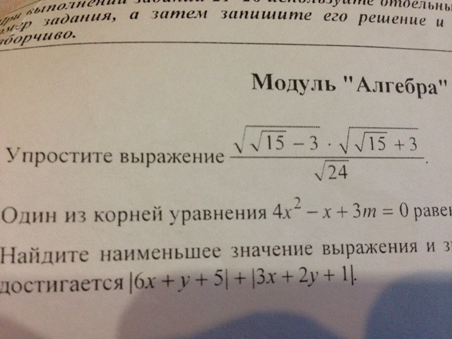 1) Корень(корень(15)-3) *корень(корень(15)+3) = корень( (корень(15)-3)*(корень(15)+3) ) = корень(15-9) = корень(6)