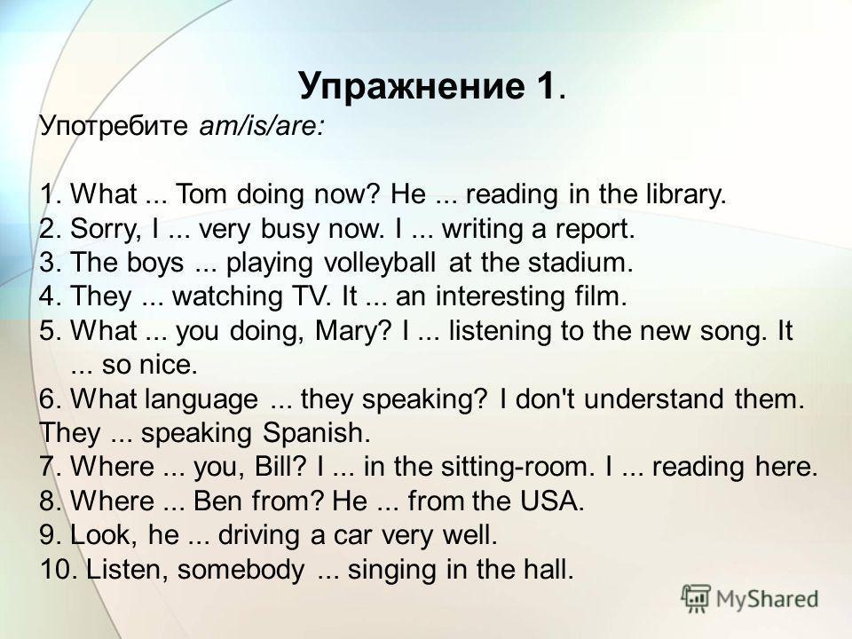 What is Tom doing now? He is reading in the library. Sorry, l am very busy now. l am writing a report. The boys are playing volleyball at the stadium. They are watching TV. lt is an interesting film. What is you doing, Mary? l am listening to the new song. lt is so nice. What language are they speaking? l don't understand them. They are speaking Spanish. Where is you Ben from? He is from the USA. Look, he is driving a car very well. Listen, somebody is singing in the hall.