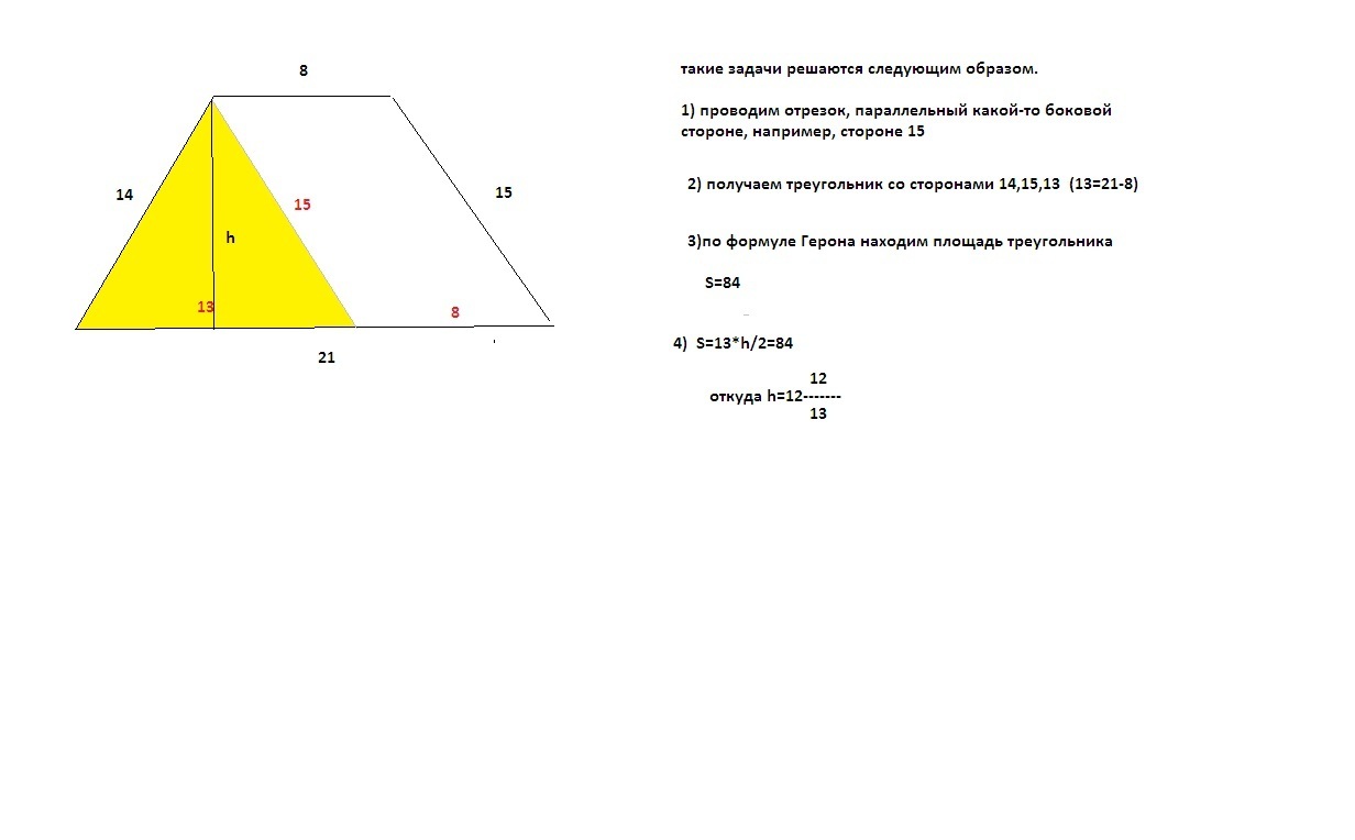 9) Найдите высоту трапеции, если ее основания равны 8 и 21 см, а боковые стороны 14 и 15