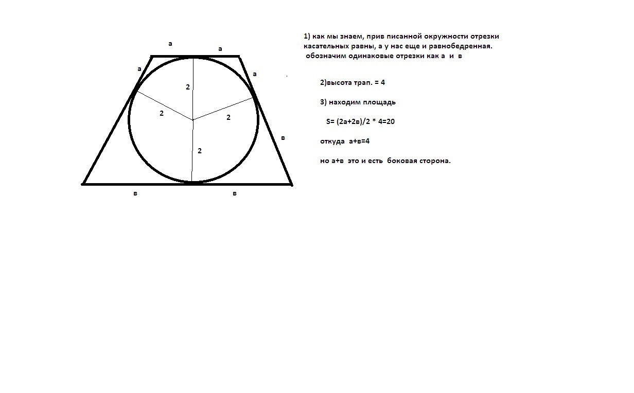 10) .в равностороннего трапецию площадью 20 см ^ 2 вписана окружность радиуса 2 см.знайдить стороны трапеции.