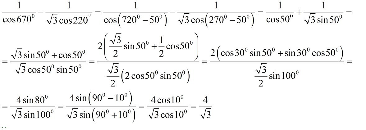 Результат вычисления 1/cos(670°) — 1/(√(3)*cos(220°)) равен .