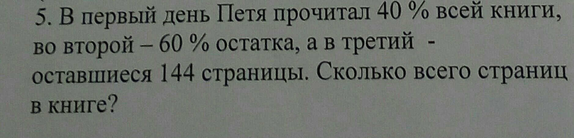 Уравнением Х=всего страниц 40%х=1день =0,4х(100%-40%)Х•60%=0,36х второй день 144стр=3день