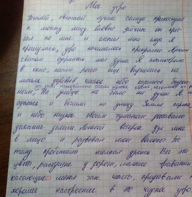 нельзя писать низкое небо ,это речевая ошибка, и дыхание земли, всмысле?)) вместо низкое небо можно написать ....кучурявое(или плывущее облака...)а вместо дыхание земли.. та его вообще не писать можно.. лучше предложение переделать, например : Я вышла на улицу и мне закрывал вид густой туман..добавить можно что ты еще делала утром? ну например к тебе пришла подруга и вы пошли вместе в школу обсуждая дом работу.. или если не в школьное время, то к тебе пришли твои друзья и вы пошли кататься на роликах, скейте,, велосипедах, или купаться вообще, или тебя мама послала в магазин за продуктами для обеда или салатов(еды) на день твойрождения для гостей.... много вариантов разных))