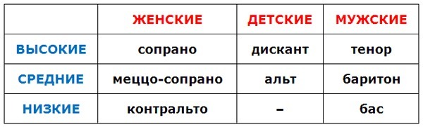 Все певческие голоса подразделяются на женские, мужские и детские. Основные женские голоса – это сопрано, меццо-сопрано и контральто, а самые распространённые мужские голоса – тенор, баритон и бас. Все звуки, которые можно спеть или сыграть на музыкальном инструменте, бывают высокими, средними и низкими. Музыканты, когда говорят о высоте звуков, пользуются термином «регистр», подразумевая целые группы высоких, средних или низких звуков. В глобальном смысле женские голоса поют звуки высокого или «верхнего» регистра, детские голоса – звуки регистра среднего, а мужские – звуки низкого или «нижнего» регистра. Но это верно лишь отчасти, на самом деле всё гораздо интереснее. Внутри каждой из групп голосов и даже внутри диапазона каждого отдельного голоса тоже есть разделение на высокий, средний и низкий регистр. Так, например, высоким мужским голосом является тенор, средним – баритон, а низким – бас. Или, ещё пример, у певиц самый высокий голос – сопрано, средний голос вокалисток – это меццо-сопрано, а низкий – контральто. Окончательно усвоить разделение мужских и женских, ну заодно и детских голосов на высокие и низкие.
