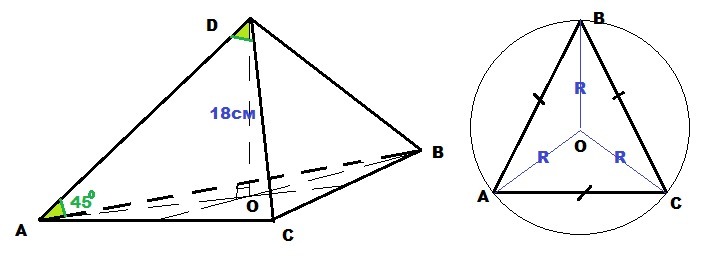 Дано: DABC - правильная пирамида - AB=BC=AC; DO = 18 см