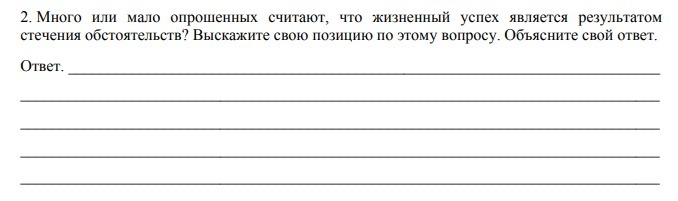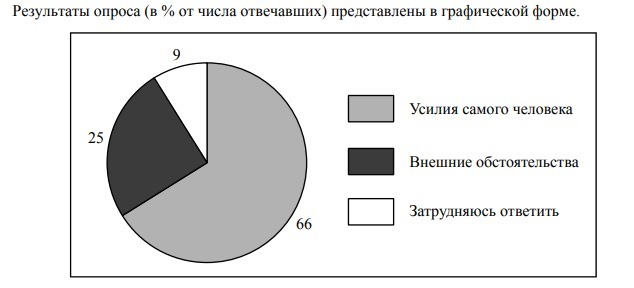 Затрудняюсь ответить - 9%, Внешние обстоятельства - 25%, Усилия самого человека - 66%. 2.Большинство людей, считают, что человек должен сам добиваться своего успеха в жизни, но и конечно стечения обстоятельств тоже в какой-то мере помогают. Я полностью согласен, что без своих усилий, жизненного успеха не будет.
