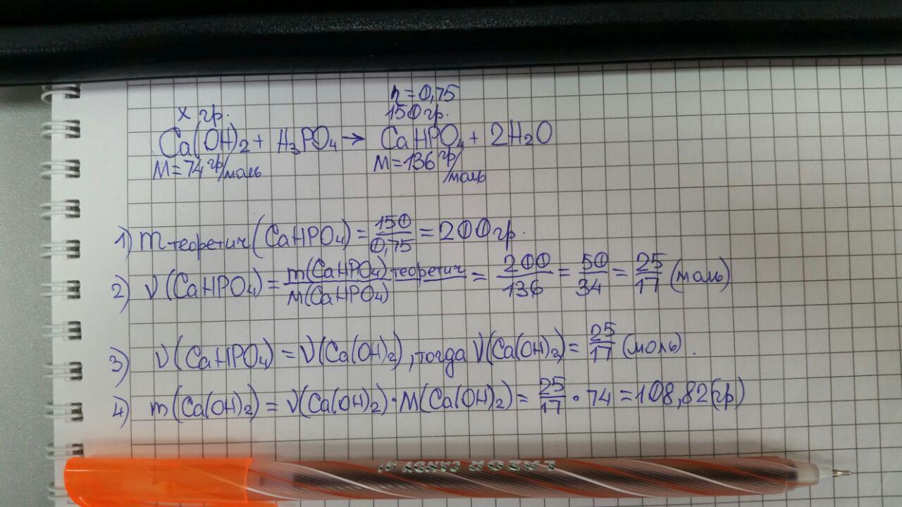 Рассчитайте массу гидроксида кальция использованного в реакции с фосфорной кислотой , если в результате реакции с 75% выходом получено 150г гидрофосфата кальция