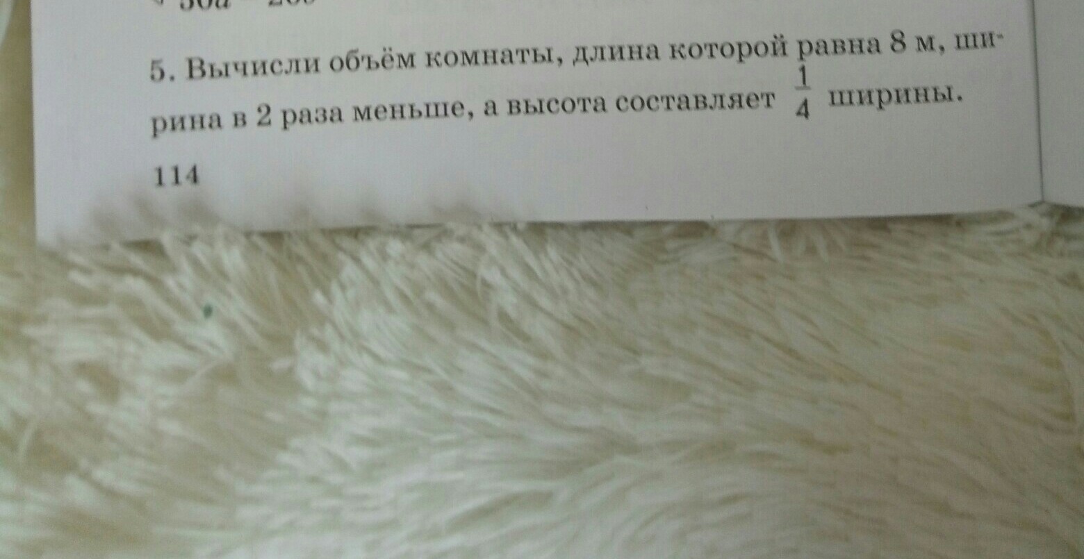 Вычисли объем комнаты длина которой равна 8 м ширина в 2 раза меньше а высота составляет 1/4 часть ширины