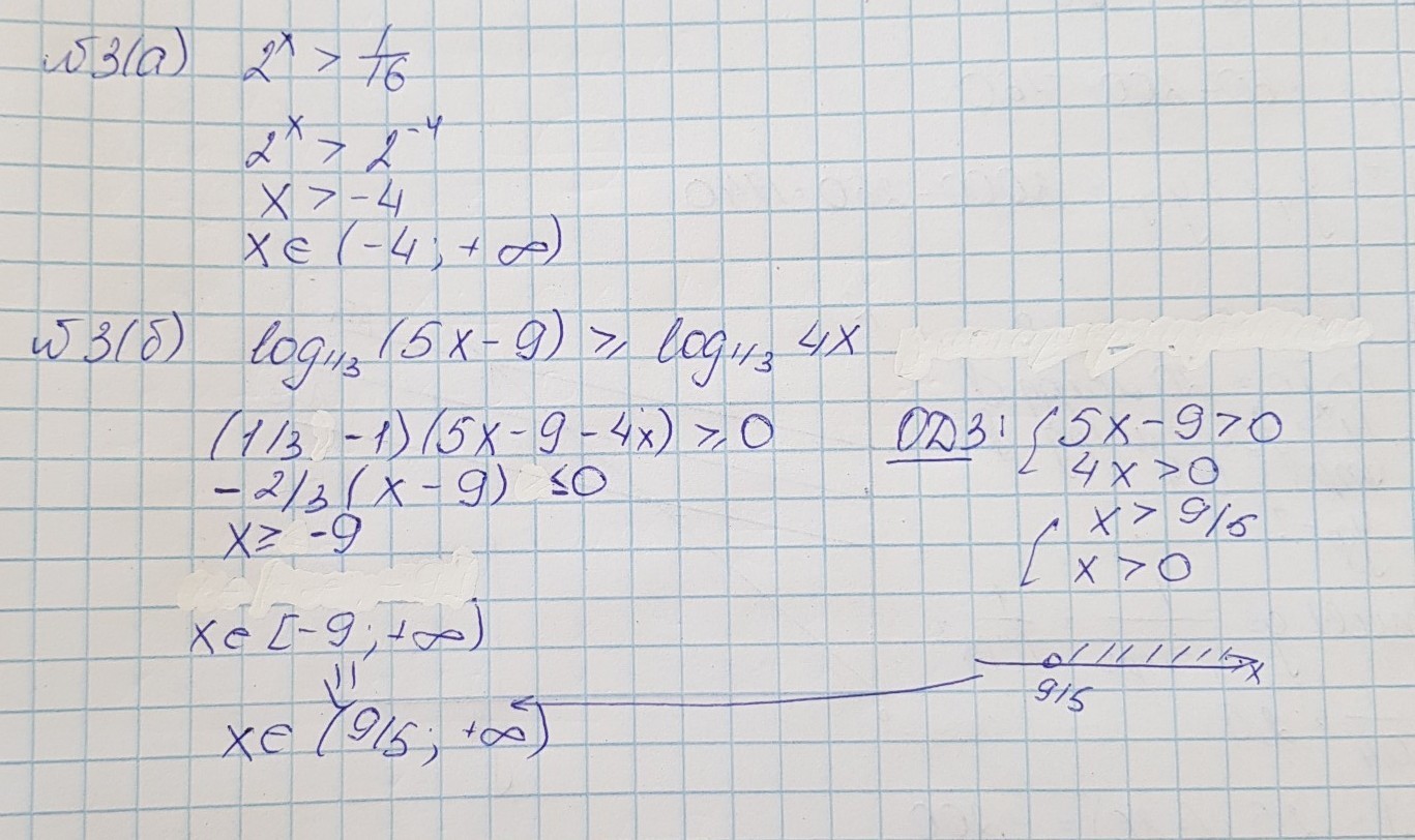 Во втором - нужно обратить внимание, что 1/3<1, поэтому знак при пепеходе будет меняться. И ещё не нужно забывать про ОДЗ, из-за него ответ может координально поменяться.