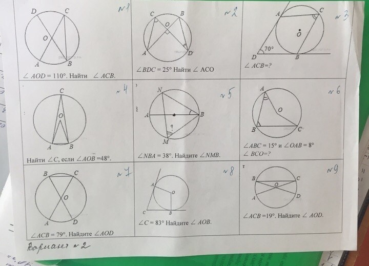 ∠BCO=360-330-8-15=7°. 7) ∠AOB=2*79=158; ∠AOD=180-158=22° 8) ∠AOB=360-90-90-83=97° 9) ∠AOD=360-180-19*2=142°