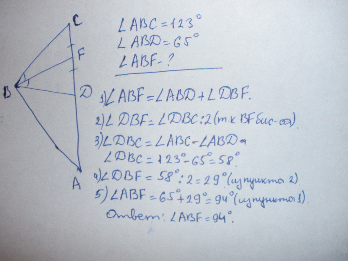 луч BD делит угол abc на два угла abc=123, abd=65. луч bf -биссектриса угла cbd. найдите угол ABF