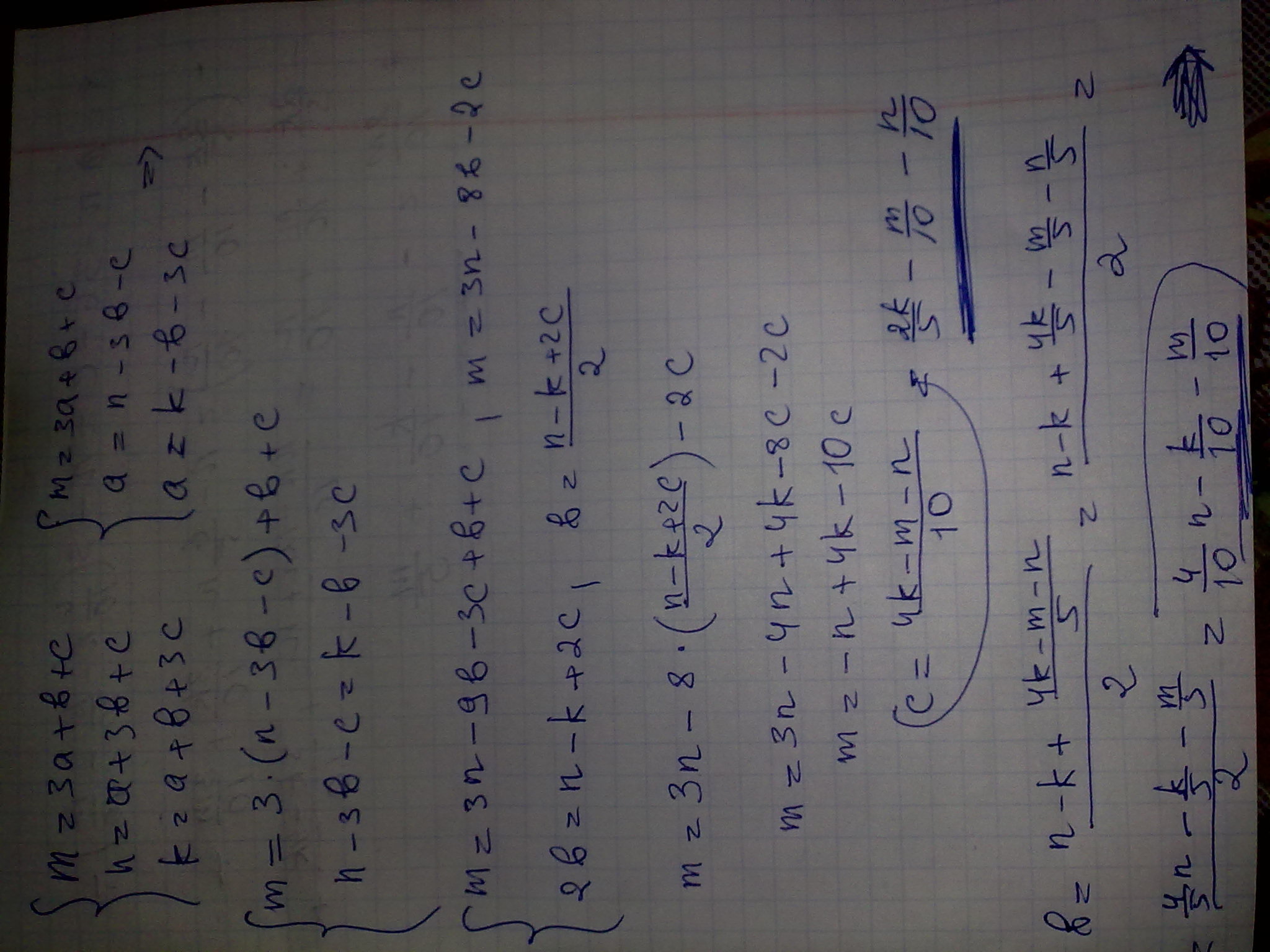 векторы m n k разложены по некомпланарным векторам a b c m=3a+b+c, n=a+3b+c, k=a+b+3c. Найдите разложение векторов a b c по векторам m n k