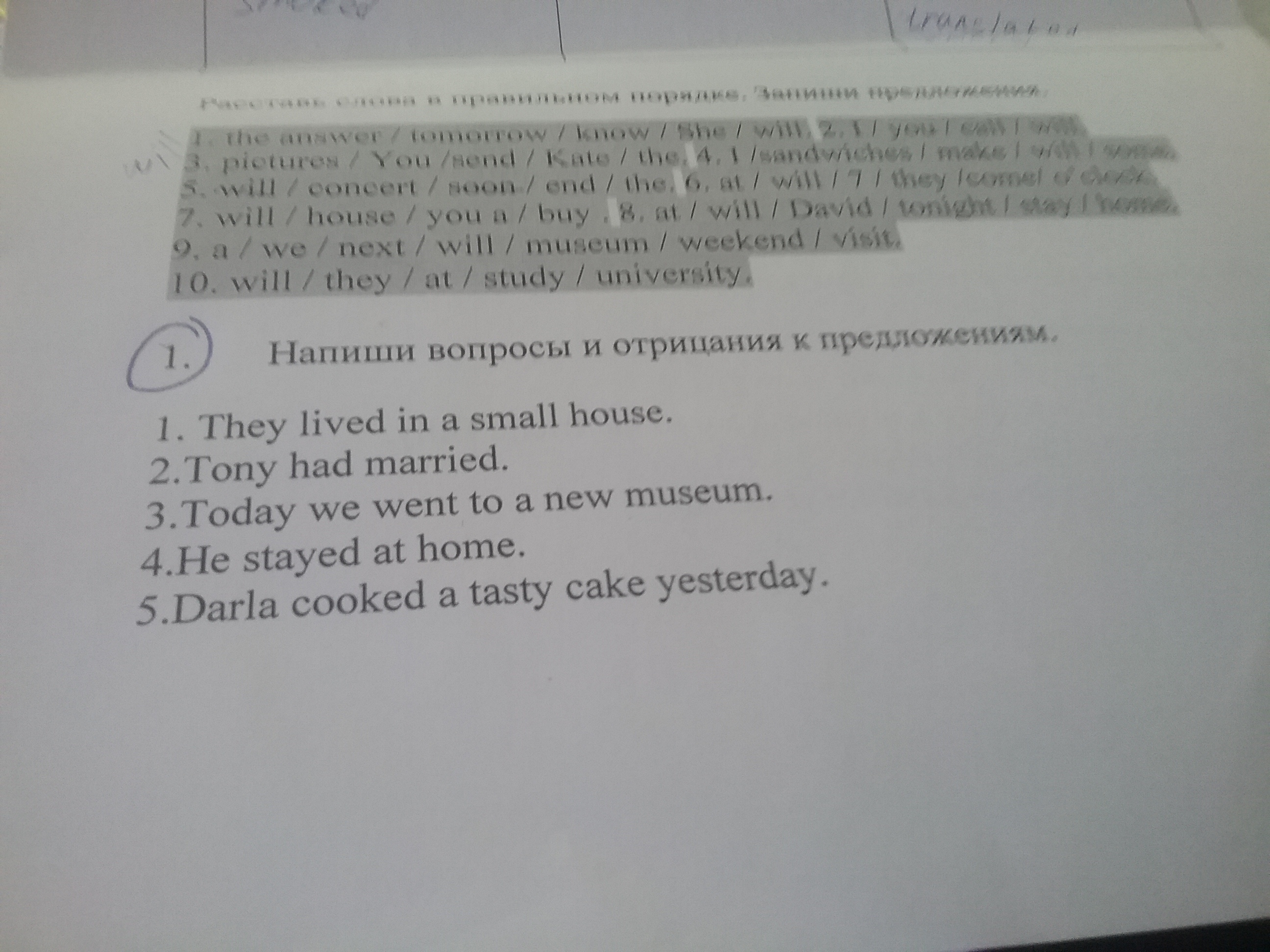 1) They didn't live in a small house .Did they live in a small house?. 2) Tony hadn't married. Had Tony married ?. 3)Today, we didn't go to a new museum.Today, did we go to a new museum?4)He didn't stay at home.Did he stay at home?.5)Darla didn't cook a tasty cake yesterday.Did Darla cook a tasty cake yesterday ?