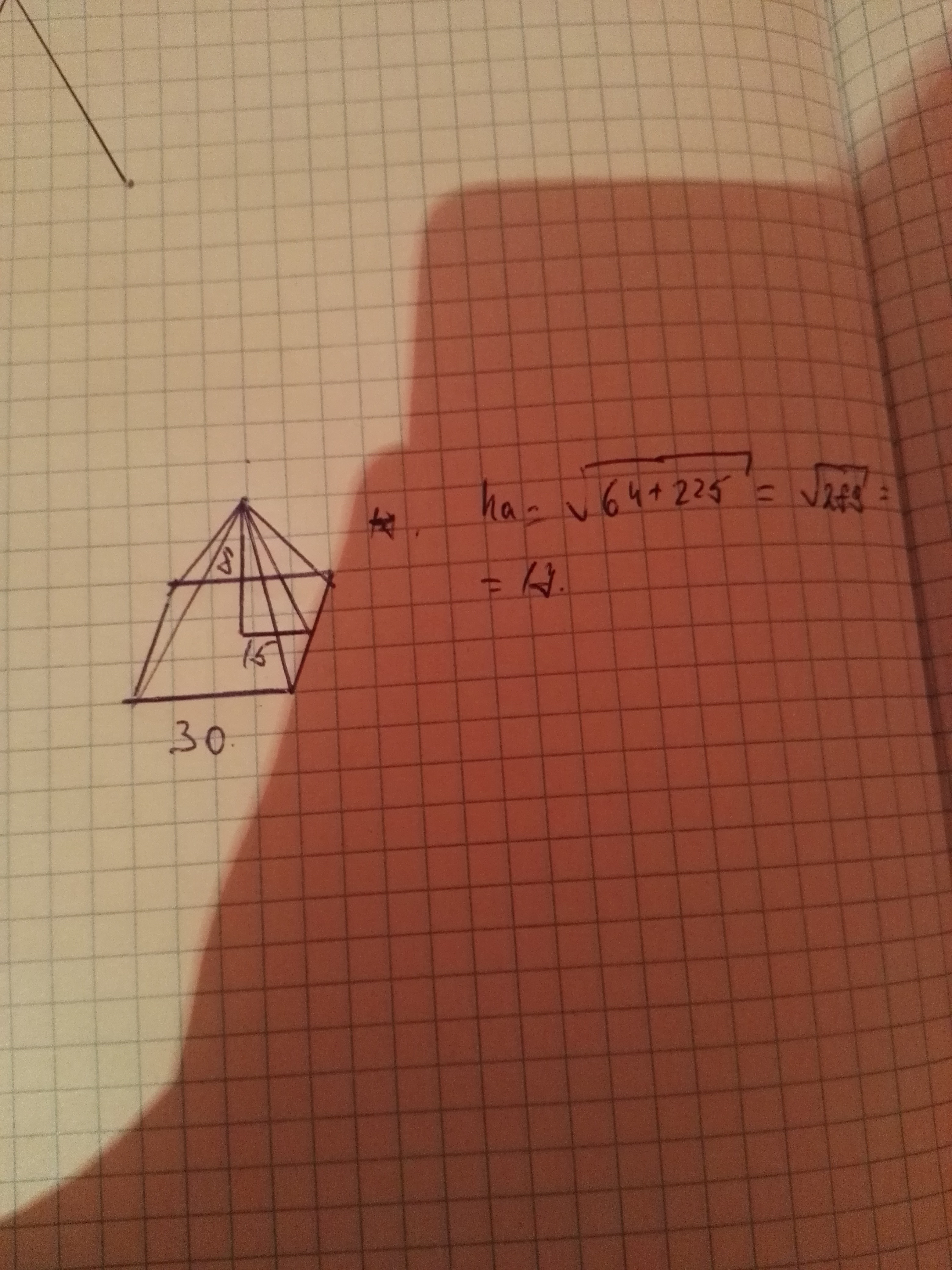 основание квадрат, сторона 30 и высота 8 там прямоугольный треугольник получается