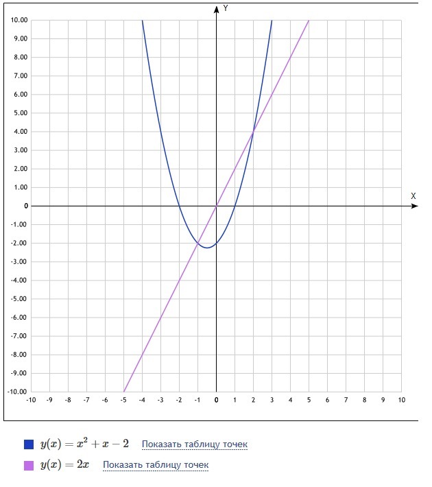 x^2+x-2=2x; x^2-x-2=0 ;D=9; x1=-1; x2=2