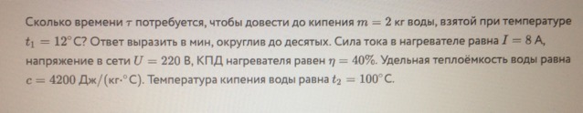 t = Q/ηIU = cm(T2-T1)/ηIU=4200*2(100-12)/(0.4*8*220)= 1050 с = 17.5 мин