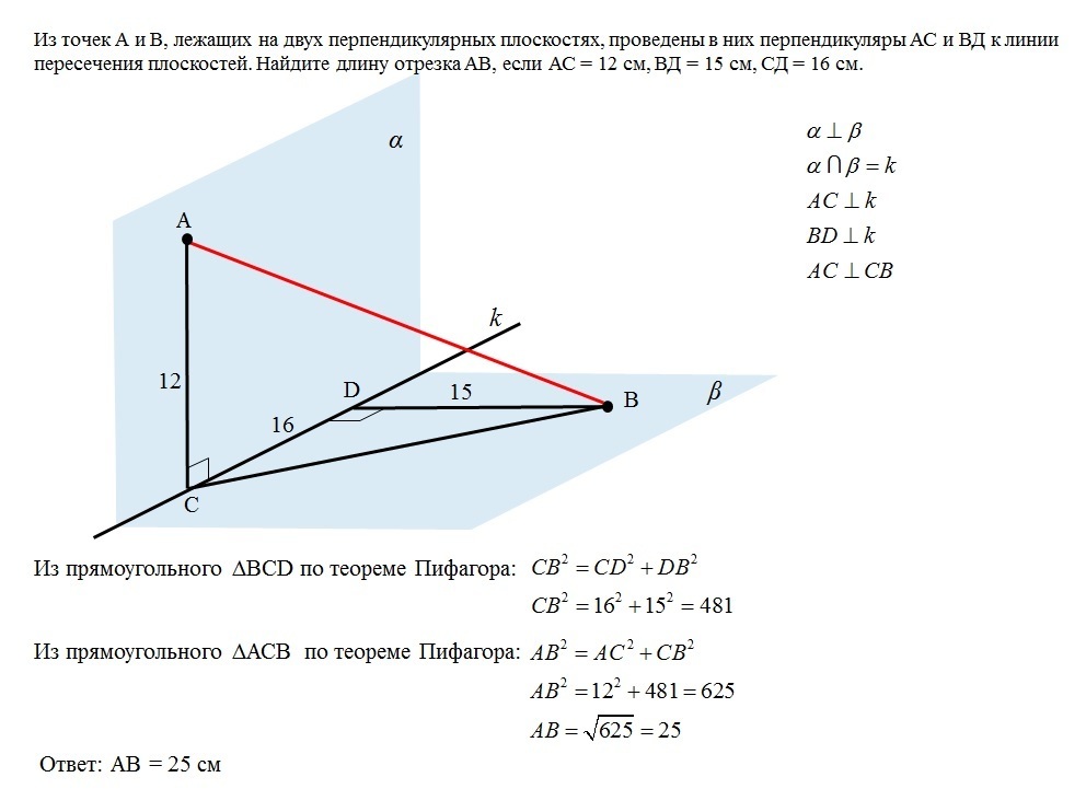 из точек А и В, лежащих двух перпендикулярных плоскостях, проведены в них перпендикуляры АС и ВД к линии пересечения плоскостей. Найдите длину отрезка АВ, если АС=12см, ВД=15см, СД=16