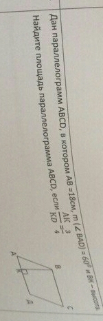 Площадь =AD*BK=21*9 коренной из 3 и это 189 коренной из 3 см^2