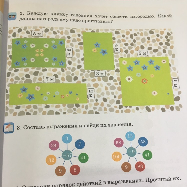 Каждую клумбу Садовник хочет отнести изгородью. Какой длины изгородь ему надо приготовить?