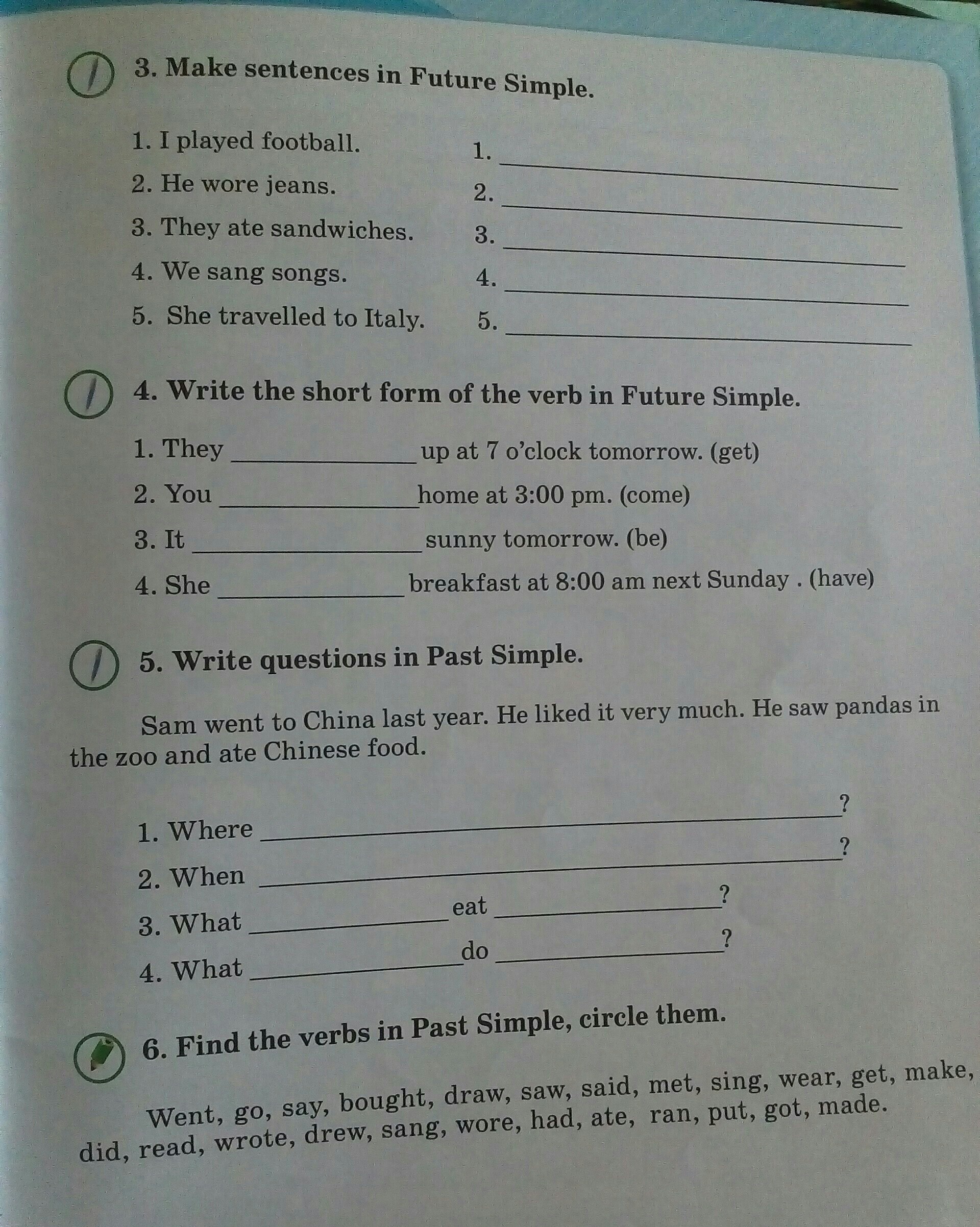 Went, bought, saw, said, met, did, wrote, drew, sang, wore, had, ate, ran, got, made, а read и put - одинаково во всех 3-х формах, так что их тоже можно обвести.
