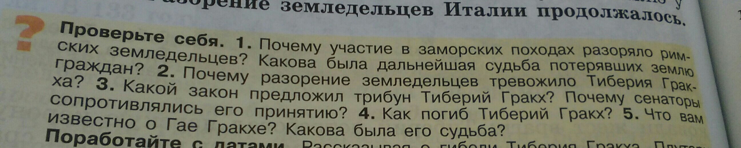 1. Потому что корабли в плаваниях часто разоряли пираты, забирая все и всех до последнего в рабство или на базар.Судьба потерявших землю граждан была такова: они скитались со всеми нщими по Риму со всеми остальными брошеными и ненужными людьми.2.Тревожило Тиберия Гракха то, что нерадивые рабы могли устроить бунт и бежать, а еще из-за огромного кол-ва рабов становилась все меньше и меньше Римская армия, что грозило провалу в войнах.3.Тиберий Гракх предложил сенату такой закон: у каждого человека должно быть не более четверти гектара, то есть у всех богачей сократить земли, а беднякам прибавить, с чем не соглашались сенат и богачи.4.Когда Тиберий Гракх вышел на место где выбирают трибунов, ему сказали что если он не отменет свой закон его убьют.Он приложил к голове руку, дая понять, что его жизнь в опасности, но второй трибун решил, что он требует корону, и со лживым обвинением поспешил в сенат. Сенаторы долго не думая, взяли ножки от скамеек и убили Тиберия Гракха с его сторонниками. Ночью их тела сбросили на остров.5.Гай Гракх-младший брат Гиберия, который продолжил дело своего брата, когда он стал трибуном.И все таки издал этот закон.Всех сторонников Гая убили, а сам Гай гракх покончил жизнь самоубийством. В ту ночь погибло около 4000 человек.