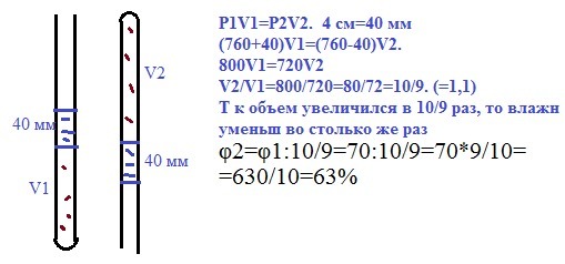 В запаянной трубке, что стоит вертикально открытым концом вверх, под столбиком ртути высотой 4 см содержится воздух, относительная влажность которого 70 %. Какой станет относительная влажность, если трубку повернуть открытым концом вниз? Ртуть из трубки не выливается. Атмосферное давление равно 760 мм рт. ст. Желательно с рисунком.