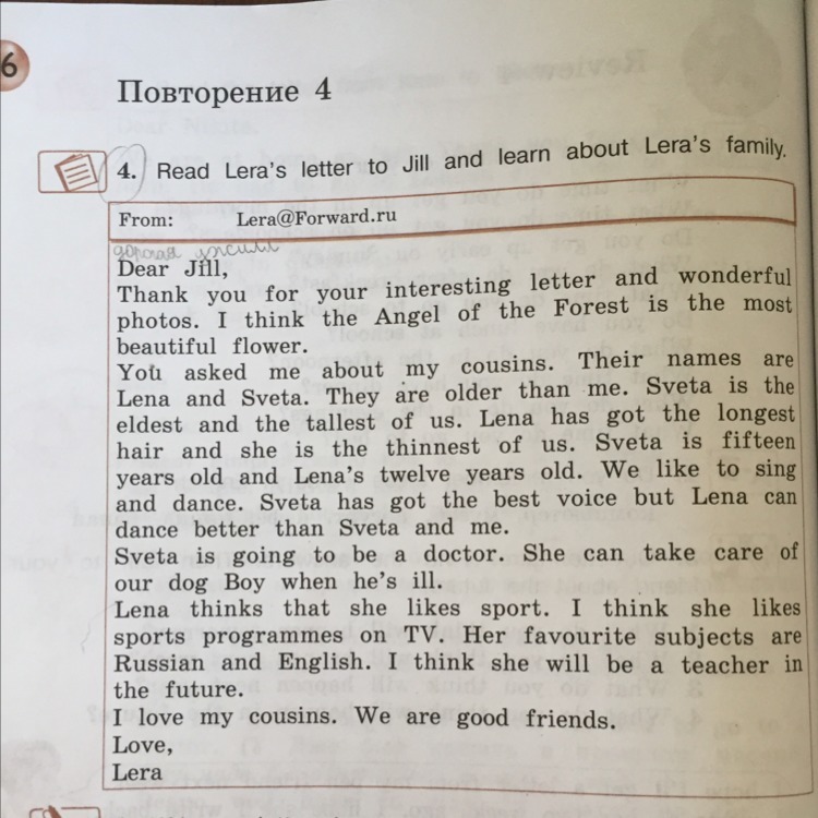 Спасибо тебе за интересное письмо и чудесные фотографии.Я думаю что Ангел леса самый красивый цветок. Ты спрашивал меня о моих кузинах( двоюродных). Их имена Лена и Света. Они старше меня.света самая старшая и самая высокая из нас. У лены самые длинные волосы и она стройнее всех. Свете 15 а Лене 12 лет.нам нравится петь и танцевать. У светы самый лучший голос но лена танцует лучше чем света и я. Света собирается быть врачом.она хорошо ухаживает за нашим псом когда он болеет. Лена думает что ей нравится спорт. Я думаю что ей нравятся спортивные программы по телевизору. Ее любимые предметы в школе это русский и английский. Я думаю что она станет учителем в будущем.