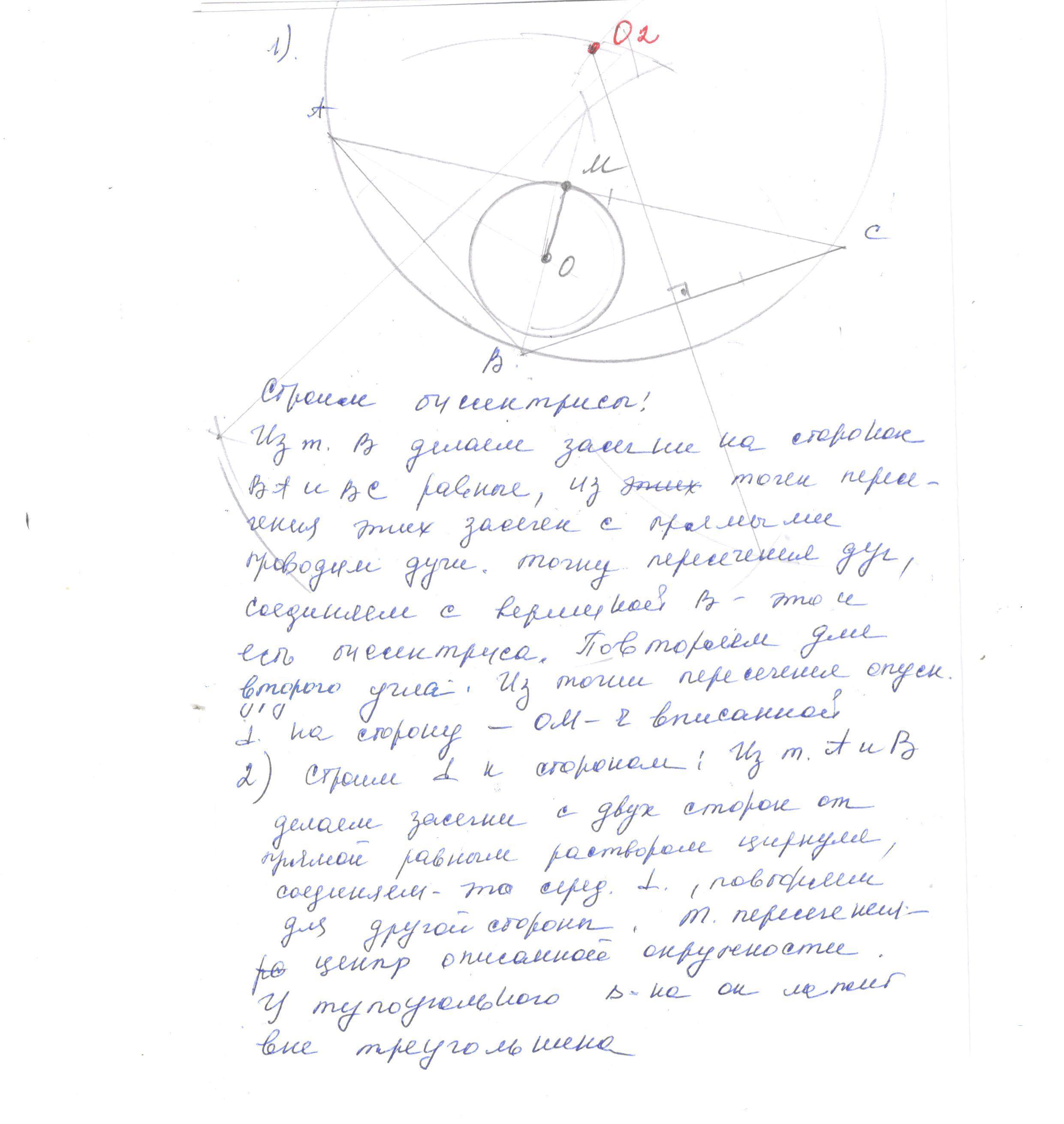 Как вписать окружность в тупоугольный треугольник? Как описать окружность около тупоугольного треугольника? Помогите пожалуйста, срочно!!! И прикрепите рисунок, как это все рисовать, ничего не понимаю, что надо делать... Очень прошу помощи!!! Дам 30 баллов