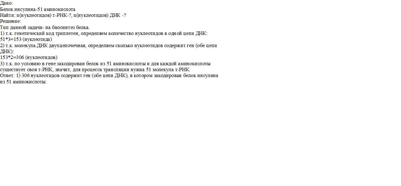 Сколько нуклеотидов содержит ген (обе цепи ДНК), в котором запрограммирован белок инсулин из 51 аминокислоты. Сколько молекул т-РНК необходимо для процесса трансляции?