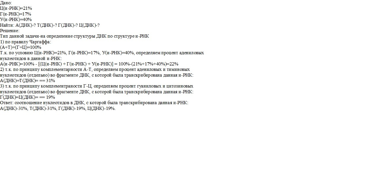 В молекуле и-РНК содержится 21% цитидиловых, 17% гуаниловых и 40% урациловых нуклеотидов. Определите соотношение всех видов нуклеотидов в ДНК, с которой была транскрибирована данная и-РНК.