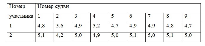 На спортивных соревнованиях 2 участника получили (по шестибалльной шкале) оценки судей, представленные в таблице: