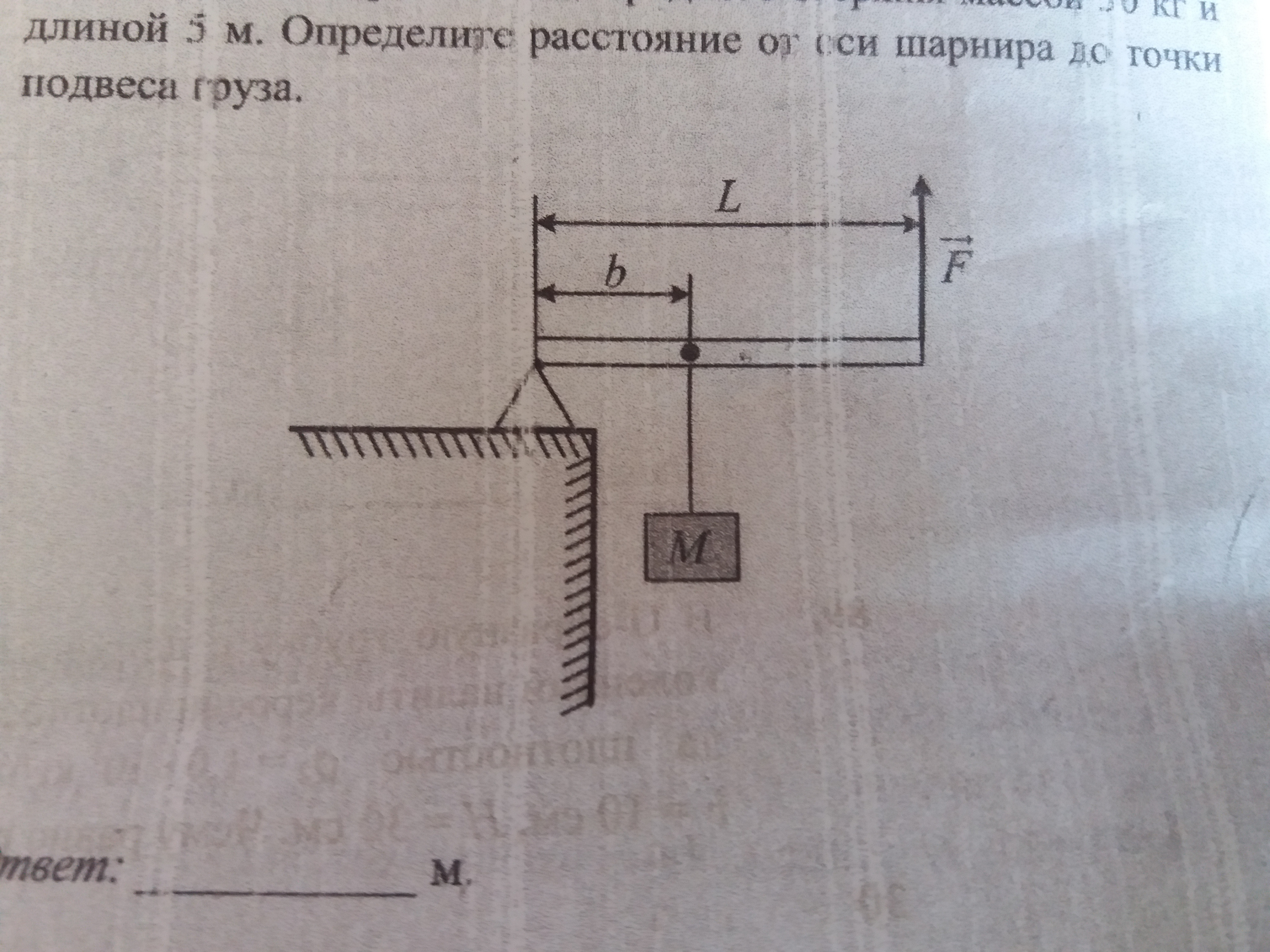 Груз массой 100кг удерживают на месте с помощьюрычага, приложив вертикальную силу 350Н(см.рис.). Рычаг состоит из шарнира без трения и однородного стержня массой 30кг и и длиной 5м. Определите расстояние от оси шарнира до точки подвеса груза.