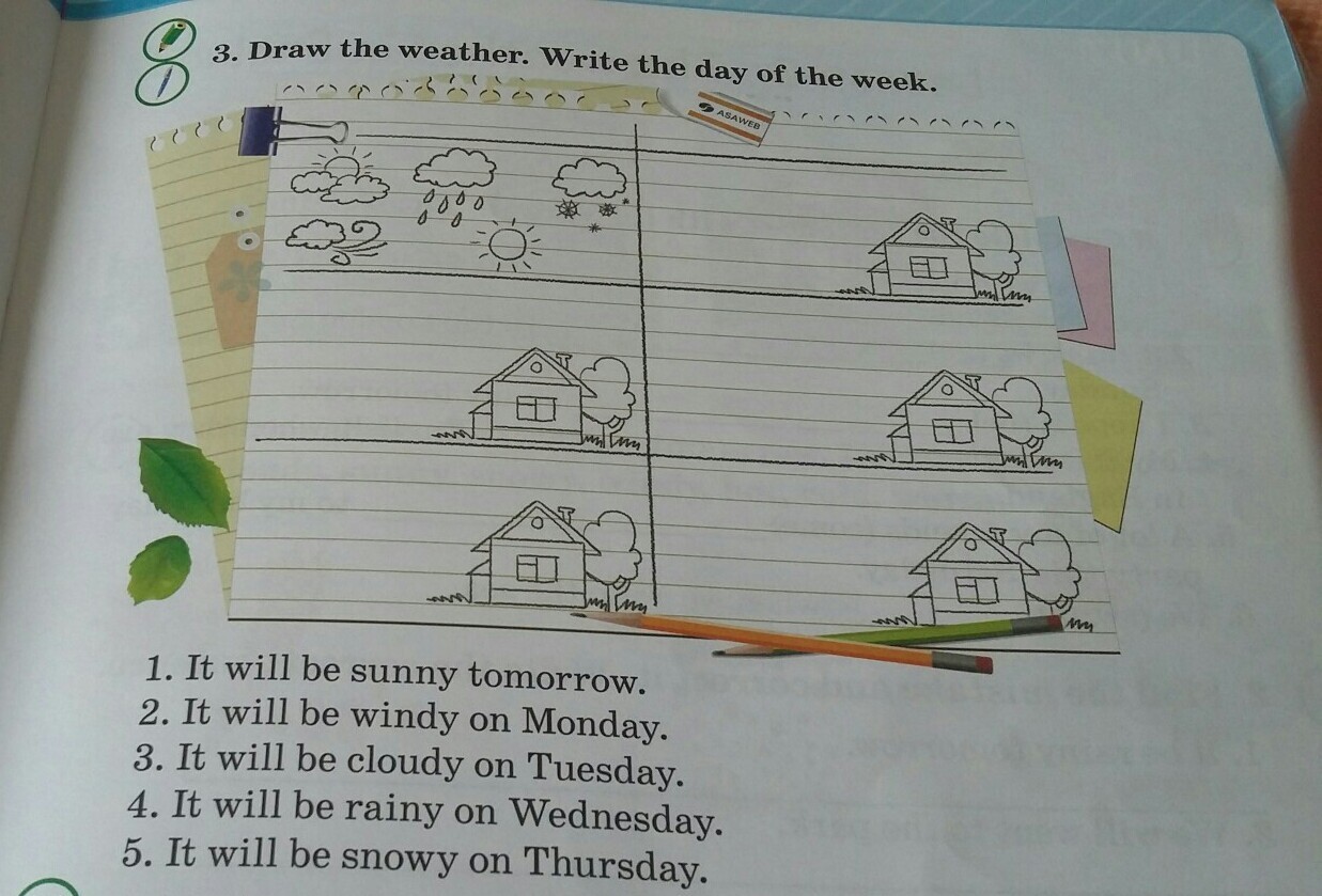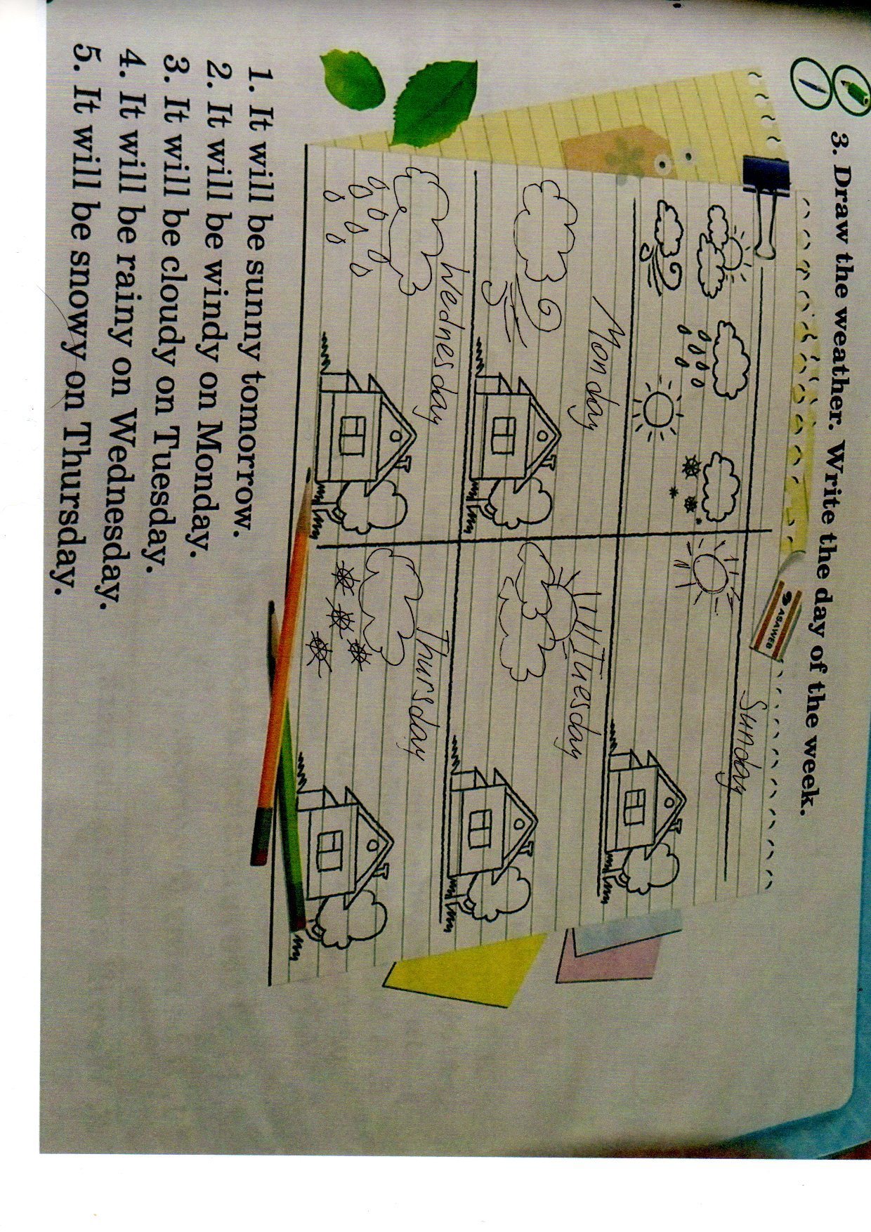 задание 3 Нарисуйте погоду . Напишите день недели.