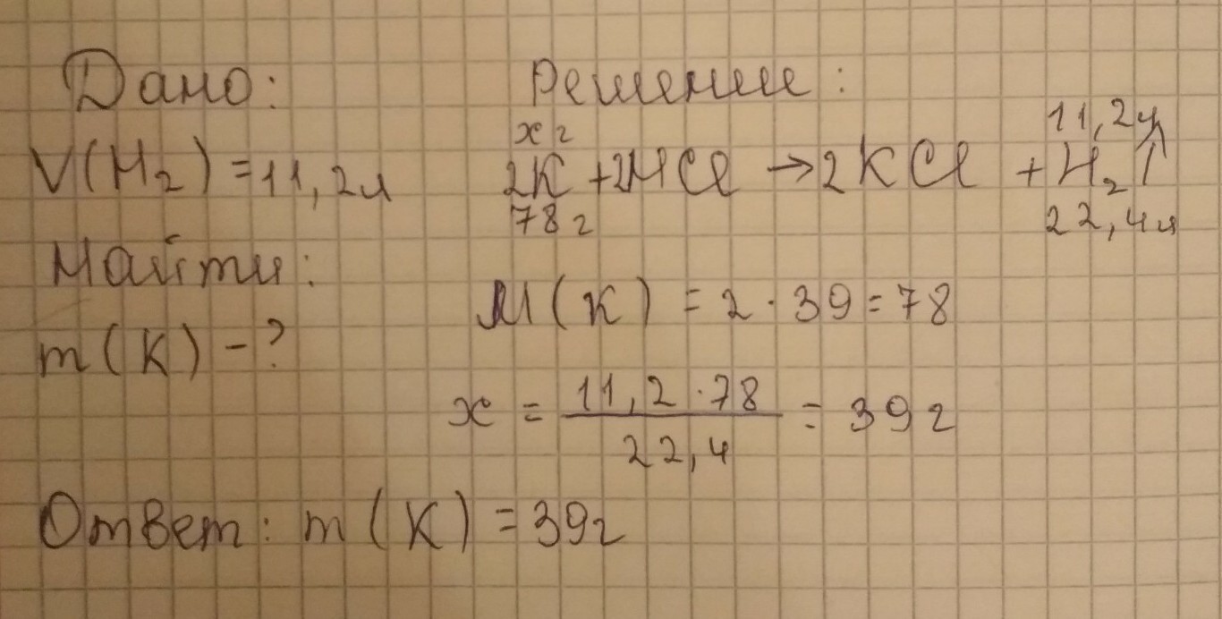 Определите массу калия, растворенного в соляной кислоте , если в результате реакции выделилось 11,2 л водорода