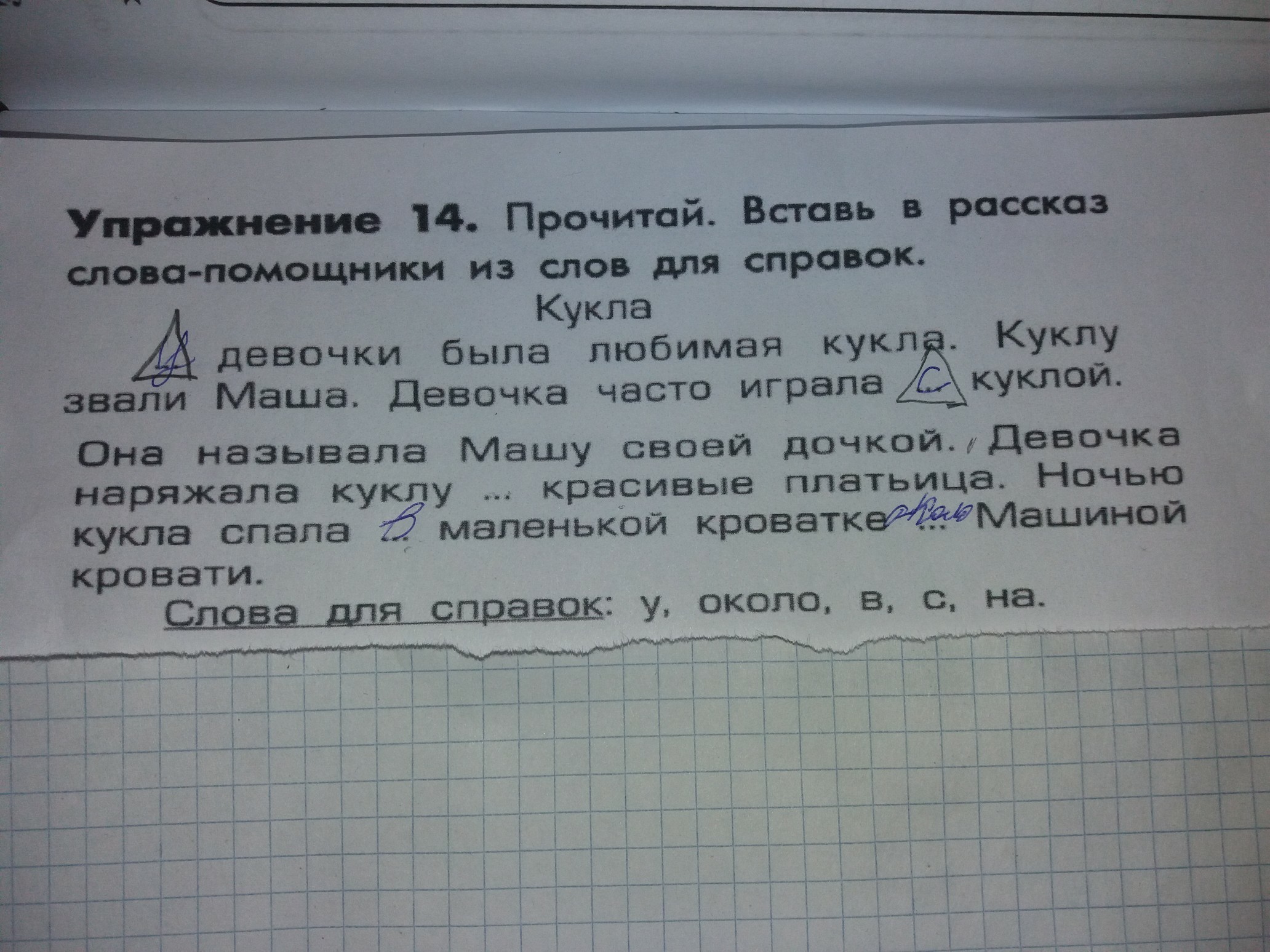 Она называла Машу своей дочкой. Девочка наряжала куклу В красивые платьица. Ночью кукла спала НА маленькой кроватке ОКОЛО Машиной кровати.