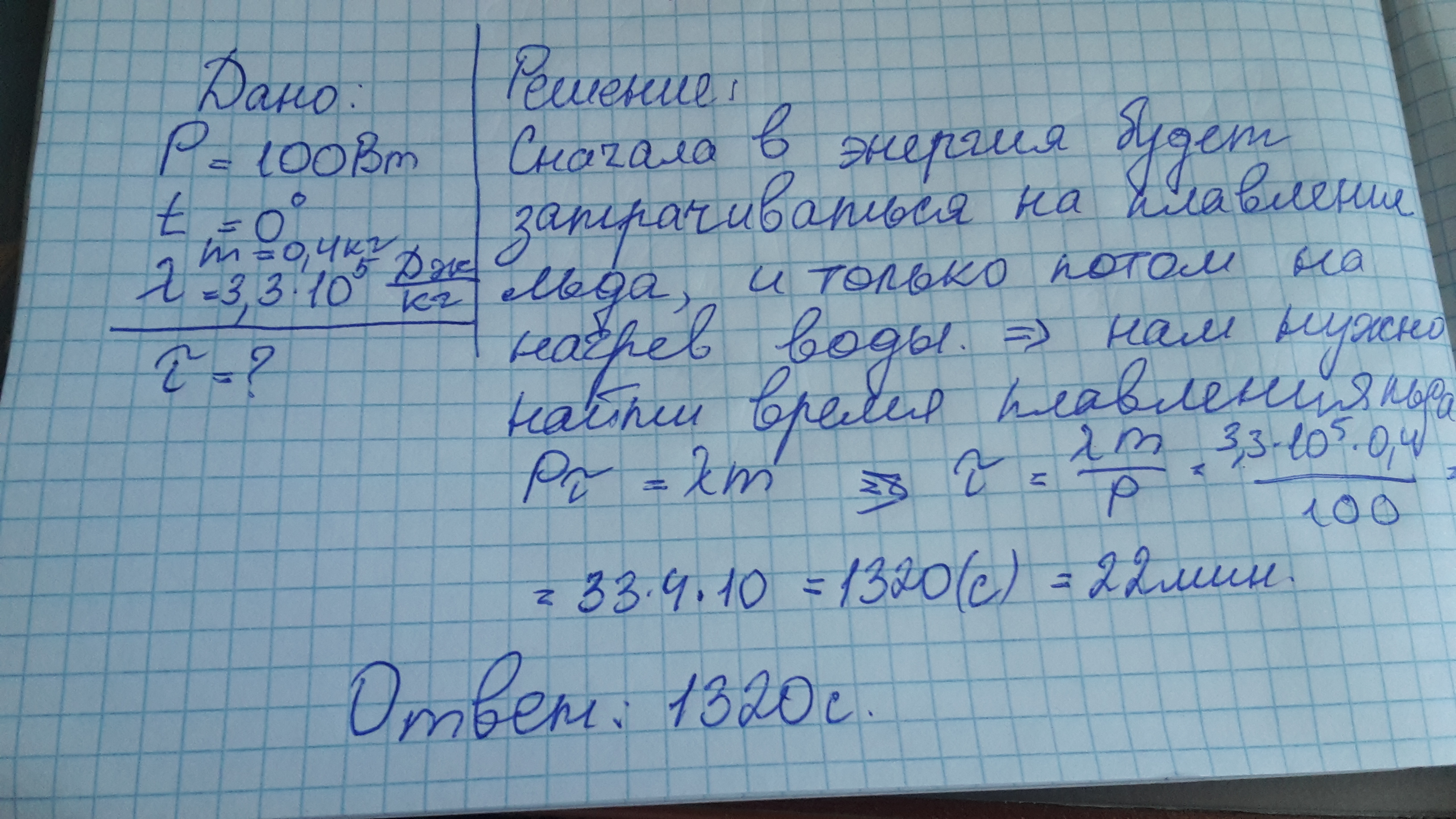В калориметре находиться электронашреватель мощностью 100вт, лед и вода при температуре 0 градусов, массы льда и воды 400г через сколько минут работы температцрв начнет расти