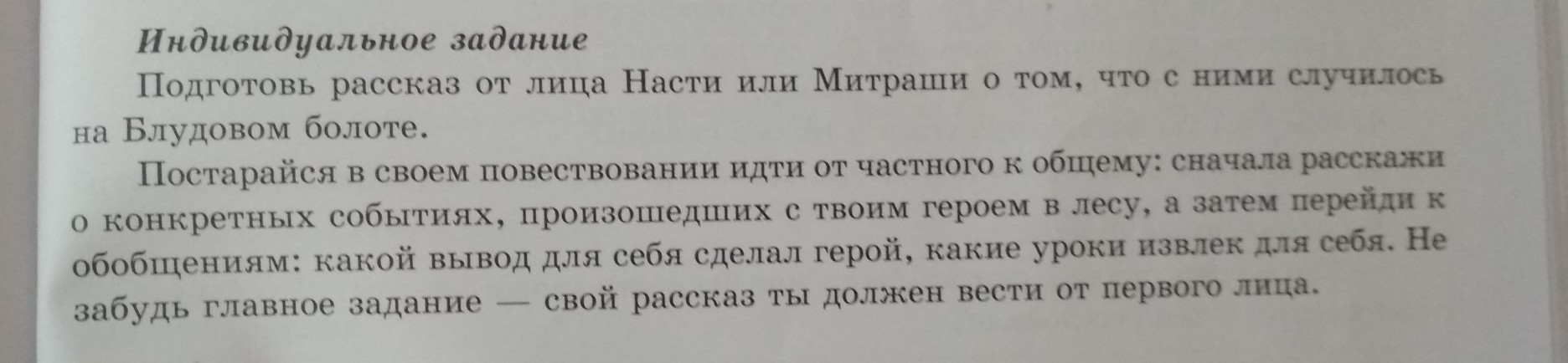 это же рассказ о кладовая солнца. Настя и Митраша братья - сёстры. на булдовом болоте Митраша попадает в беде. Его спасает собака охотника.